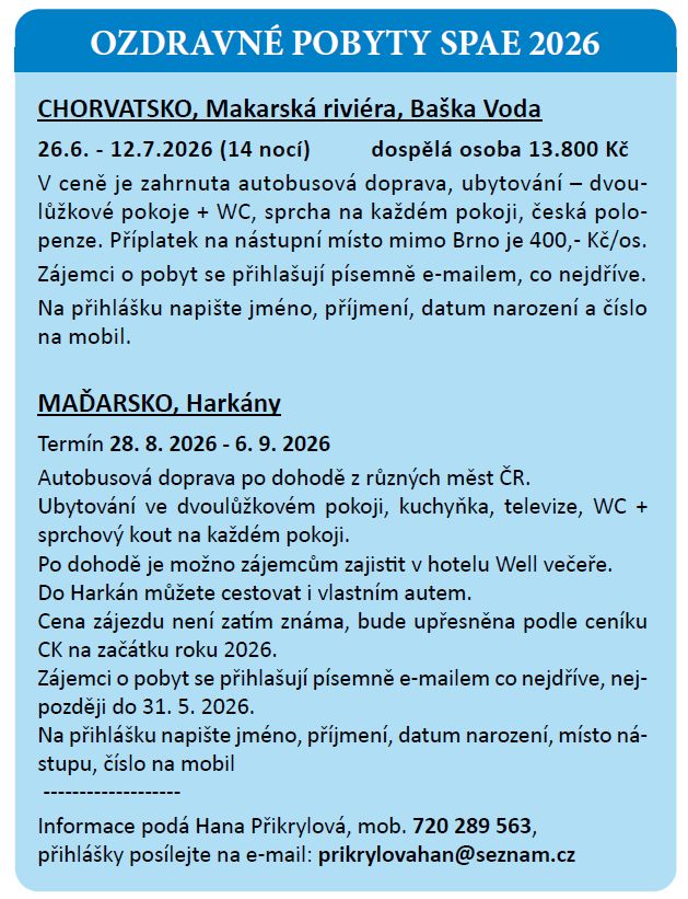 Spolek SPAE i v roce 2026 pokračuje ve své dlouholeté tradici a s radostí oznamuje, že opět pořádá oblíbené ozdravné pobyty u moře i v lázeňském prostředí.